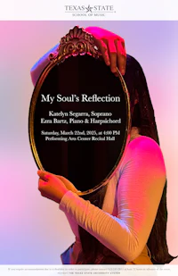 I would be honored if you joined me for my Senior Recital, “My Soul’s Reflection” of March 22nd at 4:00 PM in the Performing Arts Center Recital Hall. Should you not be able to attend, the livestream link is below. Please join me in this milestone in my college career as I share how the world around me has shaped me.